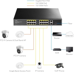 Switchen tilbyder 16 porte med PoE+ der muliggør strømforsyning op til 30 W per port og understøtter en rækkevidde op til 250 m. Det er ideelt til sikkerhedsapplikationer og nemt at installere takket være Plug&Play-funktionen.