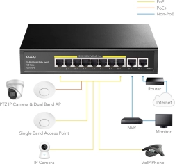 Cudy 10-port Gigabit PoE+ Switch tilbyder høj ydeevne med et samlet PoE-budget på op til 120 watt og giver mulighed for at levere op til 30 watt per port, hvilket er ideelt til at forsyne flere enheder samtidig.