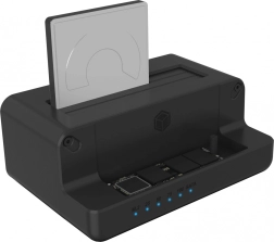Stationen er udstyret med et kombineret USB-kabel med Type-C-stik og en fast Type-A-adapter, hvilket sikrer fleksibel tilslutning til værtsenheder. LED-indikatorer viser kloningsstatus og diskaktivitet.
