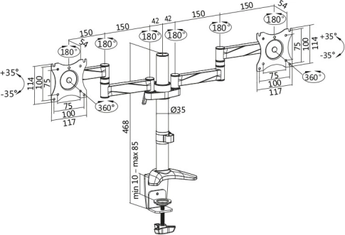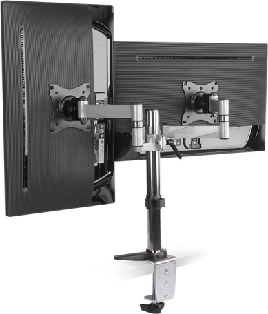 Armene gør det nemt at justere højde, hældning og rotation, så skærmene hurtigt kan tilpasses din kropshøjde og den aktuelle opgave. Den solide bordklemme sikrer stabilitet uden boring i væggen og sparer samtidig plads.
