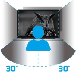 Natec Owl privatlivsfilter tilbyder moderne skærmbeskyttelse med mikropersienne-teknologi, som sikrer, at indholdet ikke er synligt fra siden. Ved en synsvinkel på 30 grader fremstår skærmen helt sort.
