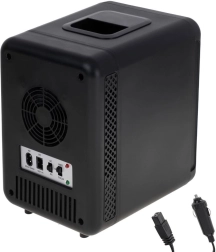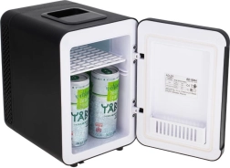 Det indvendige rum på 4 liter med hylde og dørkurv gør det nemt at organisere små flasker, dåser og bægre. Et robust bærehåndtag og kompakte mål sikrer let håndtering, mens 230 V/12 V strømforsyning gør, at køleskabet kan bruges både hjemme og i bilen. Begge strømkabler følger med, og på bagsiden findes en HOT/COLD-omskifter.