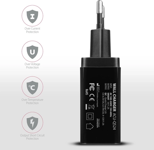 AXAGON ACU-QS24 er designet til sikker og effektiv opladning af dine mobile enheder. Med to uafhængige USB-porte, der tilbyder Quick Charge 3.0 og Smart 5V/1.2A, kan du hurtigt oplade både telefoner og tablets.