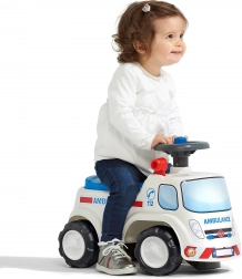 Den stilfulde gåbil i ambulance-look understøtter børns fantasi og udvikling af balancen. Takket være rattet med horn lærer børnene at koordinere bevægelserne bedre, mens brede hjul og en stabil konstruktion giver tryghed på de første køreture.