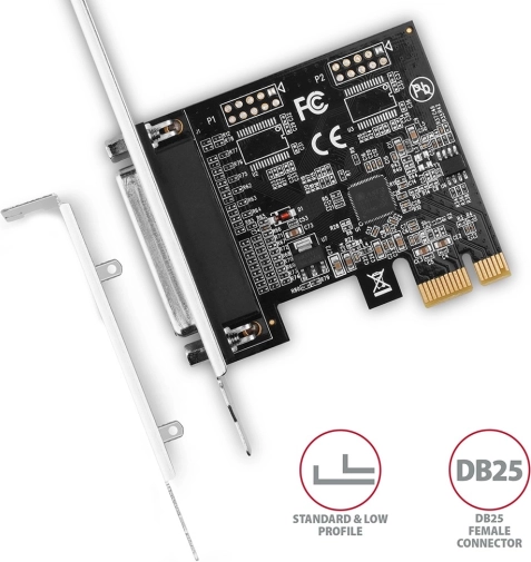 Udvid din stationære pc med en klassisk LPT-port med AXAGON-kortet med ASIX AX99100-chipset. Det tilbyder 1x parallelport IEEE 1284 (DB25), kompatibilitet med SPP/BYTE/ECP, PCIe 2.0 x1-grænseflade og plug and play-installation. Takket være den medfølgende low profile-slotteplade passer det både i standard- og lavprofils-kabinetter.