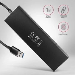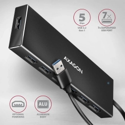 AXAGON HUE-F7A er en slim design hub i aluminium, der sikrer høj mekanisk holdbarhed og forhindrer fingeraftryk. Hubben tilbyder en separat USB-A port foran for nem tilslutning af større enheder.