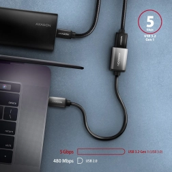 Den kompakte kabeladapter AXAGON RUCM-AFAC forbinder enheder med USB-A-stik med alle moderne enheder med USB-C. Den tilbyder hurtig dataoverførsel op til 5 Gb/s, opladning med op til 3 A og robuste aluminiumsender for lang levetid. Takket være kvalitetsafskærmning og forgyldte kontakter sikrer den stabil og pålidelig forbindelse både hjemme og på farten.