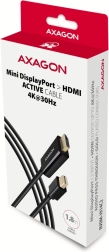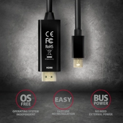 Det aktive AXAGON Mini DisplayPort → HDMI-kabel kombinerer konverter og forbindelseskabel i én løsning. Du skal blot tilslutte for straks at overføre billede og lyd til HDMI-enheder. Understøtter opløsninger op til 4096 × 2160 ved 30 Hz, hvilket sikrer skarpt billede og flydende præsentationer eller video i 4K.