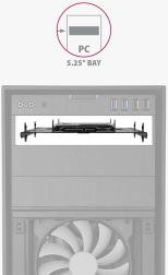 - Rammemål og monteringshuller svarer til en standard 5,25" plads i PC-kabinet.