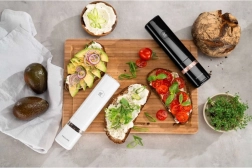 Den kraftige motor, der drives af et genopladeligt lithium‑ion batteri, sikrer stabil ydeevne og lang driftstid mellem opladninger. Det integrerede LED‑lys oplyser maden, mens det gennemsigtige vindue gør det nemt at tjekke beholdningen. Det minimalistiske design af duoen Matteo Thun & Antonio Rodriguez passer perfekt ind i moderne køkkener.