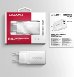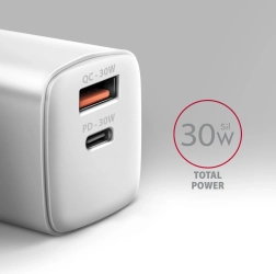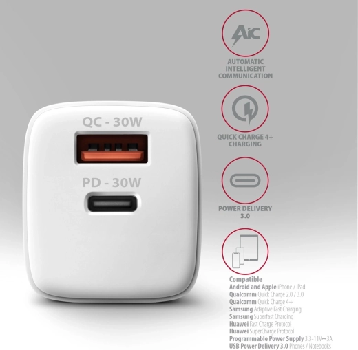 Hurtig og alsidig oplader til telefoner, tablets og mindre bærbare. Udgangene USB‑C PD 3.0 / QC 4+ og USB‑A QC 3.0 leverer op til 30 W ved individuel opladning og intelligent effektfordeling ved opladning af to enheder samtidig. Understøttelse af PPS sikrer optimal spænding og strøm til moderne smartphones.