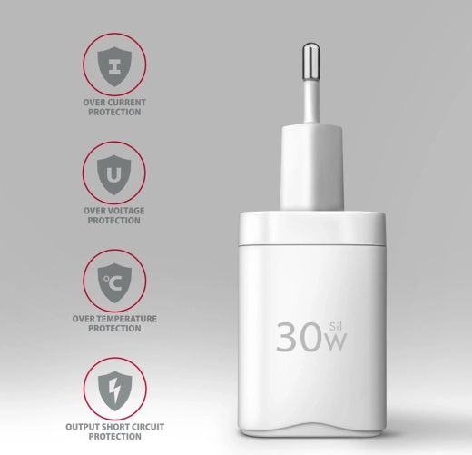 Avanceret “Super silicon”‑teknologi (Si) giver kompakte mål, højere effektivitet og stabil, sikker opladning. WIV (Wide Input Voltage) muliggør brug i et bredt spændingsområde på 100–240 V, hvilket gør den til et fremragende valg til rejser. Automatisk enhedsidentifikation AIC og styring CV/CC optimerer ladehastighed og forløb.