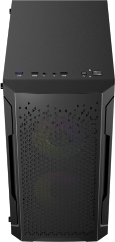 Nem adgang til topanelet med to USB 2.0‑porte og én USB 3.0‑port. På topanelet findes to USB 2.0 og én USB 3.0, som nemt kan tilsluttes. Derudover HD‑lydporte til hovedtelefoner og mikrofon, strømknap og resetknap (til styring af ARGB‑belysning).
