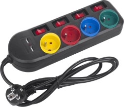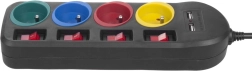 Hver af de farvekodede stikkontakter har sin egen afbryder, hvilket giver kontrol over strømstyring af enhederne og øger sikkerheden.
