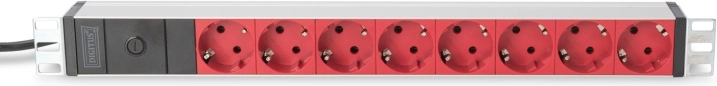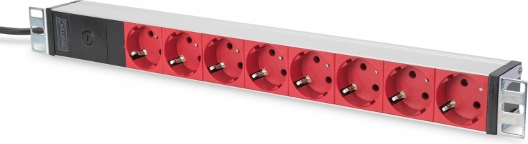 Den professionelle DIGITUS PDU er designet til 19″ racks og tilbyder pålidelig strømfordeling i området 220–240 V ved 50/60 Hz. Otte røde Schuko-udtag (CEE 7/3) med jordkontakt er drejet 35°, hvilket gør tilslutning af strømkabler nemmere og sparer plads i racket.