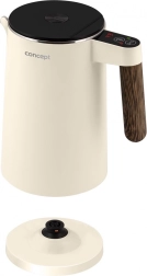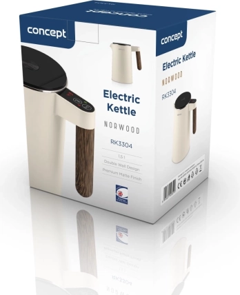 Bring stil og komfort ind i køkkenet. Concept Norwood-kedlen kombinerer et moderne, mat look i vaniljefarve med et elegant “træ”håndtag. Takket være en kapacitet på 1,5 l kan du nemt tilberede op til 6 kopper af din yndlingsdrik. Dobbeltvæggen med Cool Touch-overflade forbliver kølig at røre ved, mens den indvendige beholder i rustfrit stål opvarmer vandet hurtigt og effektivt.