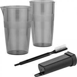 Inkluderer to måleenheder, en rengøringsbørste og en holder til tilbehør for mere organiseret opbevaring.