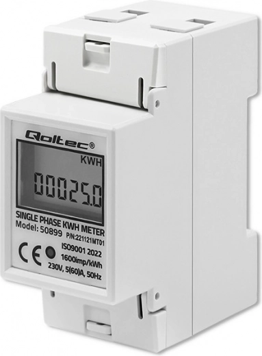 Elektronisk energimåler fra mærket Qoltec tilbyder konstant overvågning af elforbruget for enfasede enheder, der drives af vekselstrøm på 230V ved 50Hz. Den er udstyret med en LED-indikator, der signalerer energiforbruget, og en LCD-skærm, der viser den forbrugte energiværdi baseret på antal impulser med en konstant på 1600 imp/kWh. Måleren er designet til montering på DIN-skinne TH35, hvilket muliggør nem installation og brug.