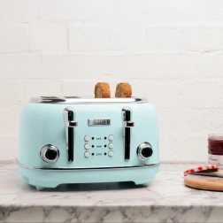 Den turkise HERITAGE brødrister i rustfrit stål er det ideelle valg til hurtig og jævn ristning af brød. Takket være de fire brede rister kan du nemt riste også tykkere skiver brød eller bagels, og centreringsfunktionen sikrer ensartet ristning på begge sider.