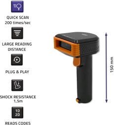 Få fart på arbejdet ved kassen, på lageret og i forsendelsen. Qoltec-læseren aflæser pålideligt 1D- og 2D-koder med høj hastighed på op til 200 scanninger/sek., håndterer scanning i forskellige vinkler, og takket være automatisk tilstand starter aflæsningen, når koden nærmes. Den robuste konstruktion i ABS klarer fald på op til 1,5 m, så den er klar til krævende brug.