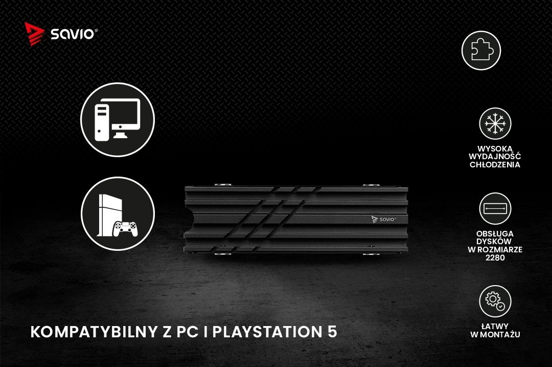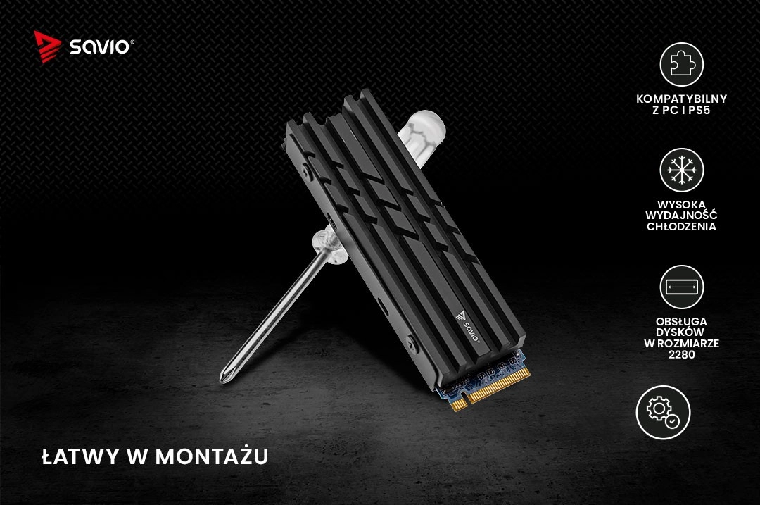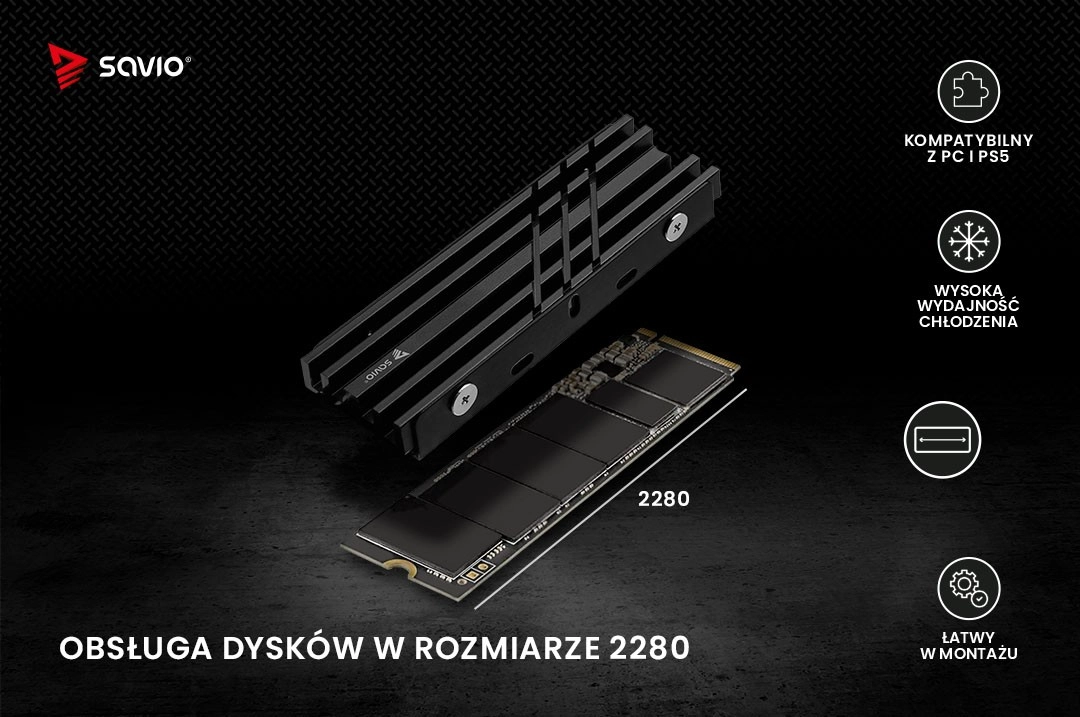 Køleren Savio AK-60 er designet til standard SSD’er i M.2-formatet 2280 og leder varme effektivt væk takket være en massiv metalkonstruktion med ribber. Den sikrer stabil drift af din NVMe-disk selv ved krævende opgaver som gaming, arbejde med store filer eller videoredigering.