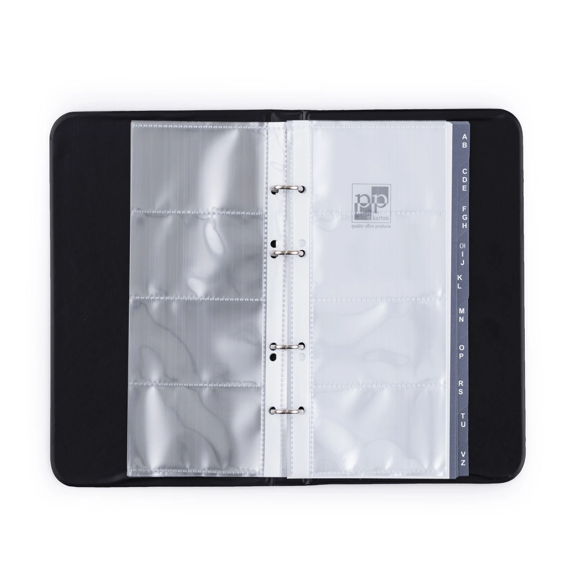 Hold dine forretningskontakter perfekt organiserede. Denne visitkortmapper med ringmekanisme giver nem udskiftning og supplering af indlæg, og rummer op til 80 standard visitkort. Den sorte højglansoverflade giver et professionelt udtryk og tåler daglig brug.