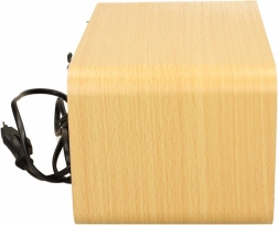 Træhuset bidrager til en mere behagelig gengivelse af stemme og musik, mens netstrøm sikrer stabil lytning uden batteriskift.