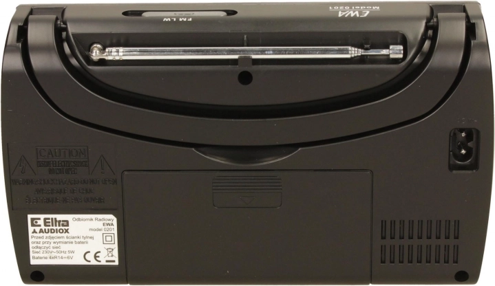 Bærbar radio EWA i sort med DL og FM/UKV, strøm fra 230 V eller batterier, teleskopantenne og hovedtelefonudgang. Perfekt til hjemmet og på farten.