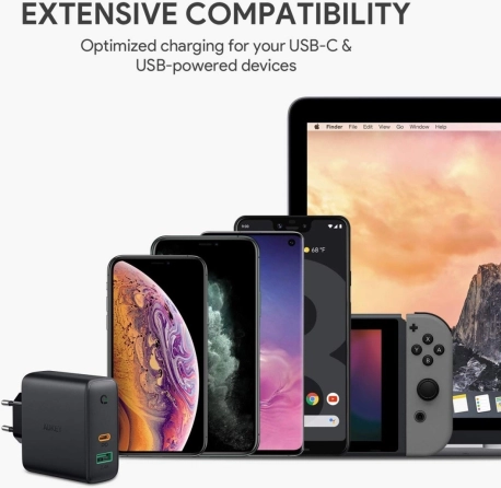 Oplad dine enheder hurtigt og effektivt med AUKEY PA-D3. De to porte – USB-C Power Delivery og USB-A – dækker alt fra mobiler og høretelefoner til mere krævende enheder, inklusive laptops og skærme, der forsynes via USB-C. Dynamic Detect fordeler effekten intelligent: op til 60 W med én tilsluttet enhed, og ved to enheder optimeres fordelingen (fx op til 45 W til den primære port) for hurtig og sikker opladning.