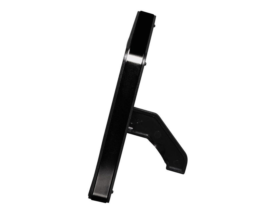 - Moderne, fladt design i sort – til bord eller vægmontering.