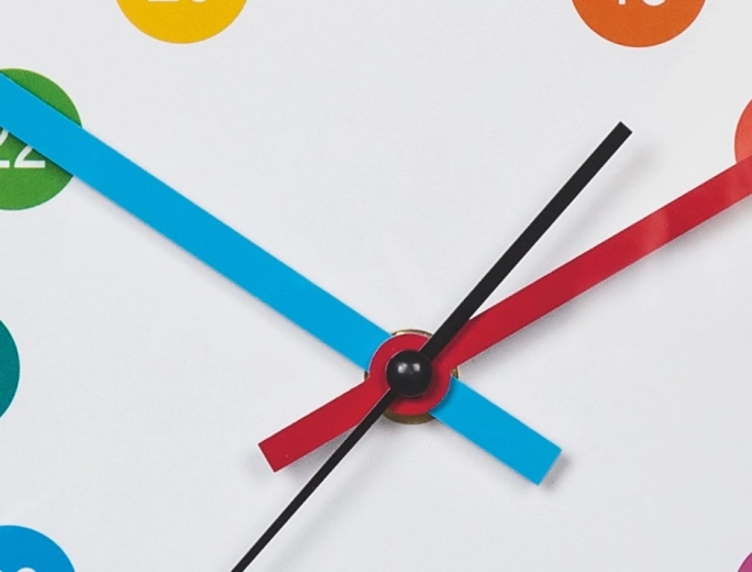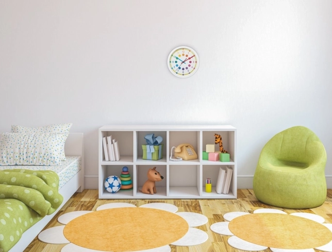 Takket være støjsvagt quartz-mekanisme med glidende sekundviser tikker uret ikke og er også velegnet til soveværelset. Det rene design med hvid ramme passer ind i ethvert børneværelse, virker legende og motiverer til læring.