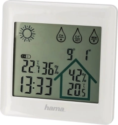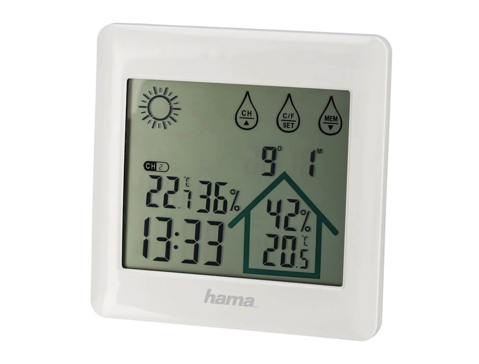 - Viser luftfugtighed indendørs og udendørs.