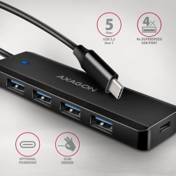 Udvid din bærbare eller telefon med fire fuldgyldige USB-A-porte. Hubben understøtter USB 3.2 Gen 1 (5 Gb/s), er Plug & Play og er ideel til rejser takket være de kompakte mål. Det indbyggede USB‑C-kabel på 19 cm gør det nemt at tilslutte moderne enheder, mens bagudkompatibilitet sikrer problemfri brug med ældre standarder.
