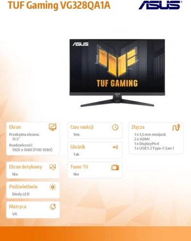 ASUS TUF Gaming VG328QA1A er en 32-tommers gamingmonitor designet til spillere, der kræver stabil ydeevne, minimalt inputlag og omfattende indstillingsmuligheder. Takket være den robuste TUF-konstruktion og moderne æstetik passer den perfekt ind i enhver gaming-opsætning.