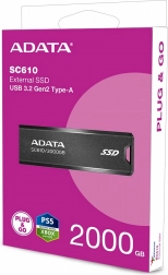 ADATA SC610 er en kompakt og bærbar ekstern SSD-disk med stor kapacitet på 2000 GB. Med understøttelse af USB 3.2 Gen2 opnår den en båndbredde på op til 10 Gb pr. sekund, hvilket muliggør hurtige og effektive dataoverførsler.