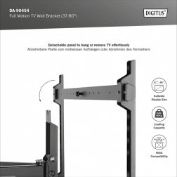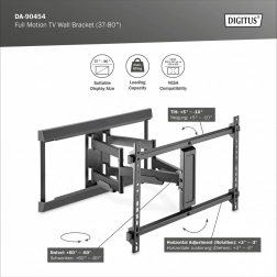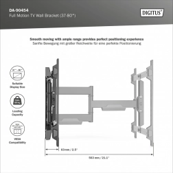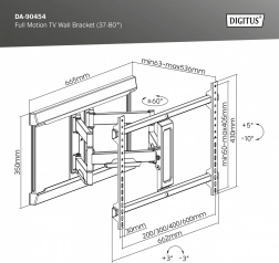 Beslaget tilbyder en udtræksarm med rækkevidde fra 6,3 til 53,6 cm, hvilket muliggør optimal vinkelindstilling for ideel visning. Drejefunktion i området fra +60 til -60° og tilt fra +5 til -10° giver tilpasning efter brugerens behov. Vandret rotation i intervallet +3 til -3° sikrer præcis placering af skærmen.