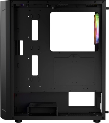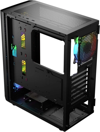 Kabinettet muliggør installation af vandkøling og har tre støvfiltre til beskyttelse mod støv. Der er et panel med USB-porte, herunder to USB 2.0 og én USB 3.0, som giver nem adgang og tilslutning af enheder. Med det medfølgende ARGB-lys kan du ændre belysningen via en kontrolknap på topanelet.