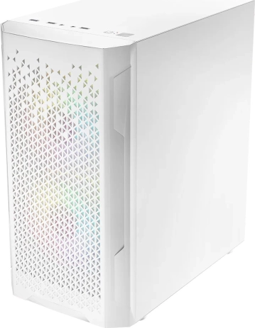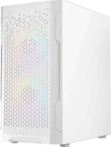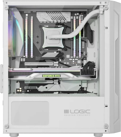 LOGIC Aramis ARGB Mini i elegant hvid kombinerer moderne design og gennemtænkt airflow. Frontpanelet med fin meshstruktur lader rigeligt med luft ind, mens to forudinstallerede 120 mm ARGB blæsere holder komponenterne kølige og giver opsætningen stil. Sidepanelet af hærdet glas lader dit grafikkort og oplyste elementer komme til deres ret, og belysningen skifter du nemt med RESET-knappen på topanelet.