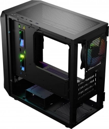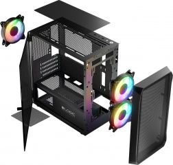Den ventilerede front sikrer luftstrøm takket være to effektive 120 mm blæsere. Bagsiden af kabinettet er udstyret med en fabriksmont. 120 mm blæser.