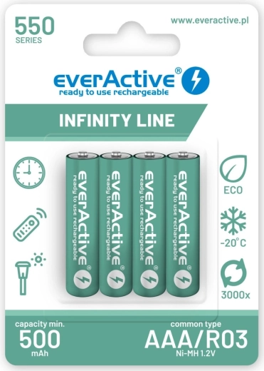 Disse AAA (R03) akkumulatorer med kapacitet på 550 mAh leveres foropladte i klar til brug-teknologi, så du kan sætte dem direkte i enheden. Serien Infinity Line er designet til lang driftstid i enheder med moderat strømtræk og tilbyder dermed driftssikker og bæredygtig ydelse.