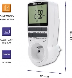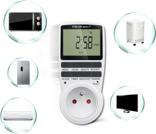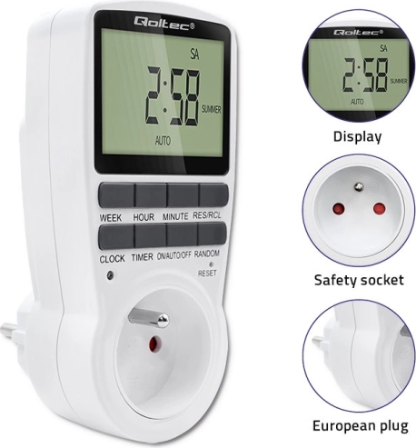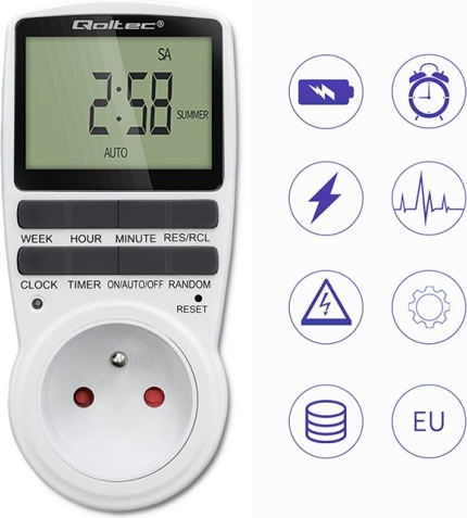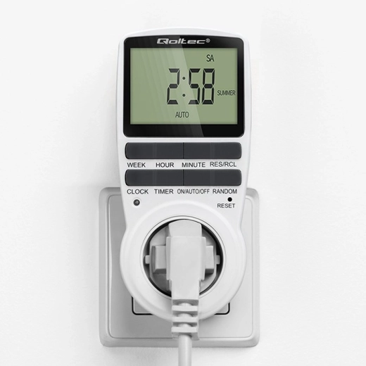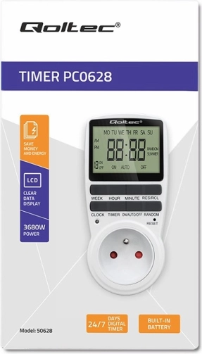 Automatisér driften af lamper, akvarier, opladere, ventilatorer eller elkedler og reducer unødvendigt forbrug. Takket være det overskuelige LCD og de intuitive knapper indstiller du nemt dag, time og minut. Qoltec-timeren tilbyder også tilfældig switching, som troværdigt simulerer tilstedeværelse i hjemmet og øger sikkerheden.