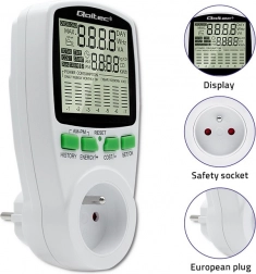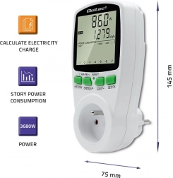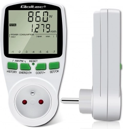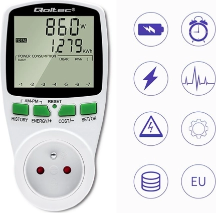 Få overblik over, hvilke enheder der er de største energislugere. Qoltec PM0627 leverer præcis måling uden gæt, så du kan beregne omkostningerne pålideligt og vurdere besparelseseffekten. Takket være den baggrundsbelyste LCD kontrollerer du nemt aktuell effekt, samlet kWh, tid og pris efter den indstillede takst.