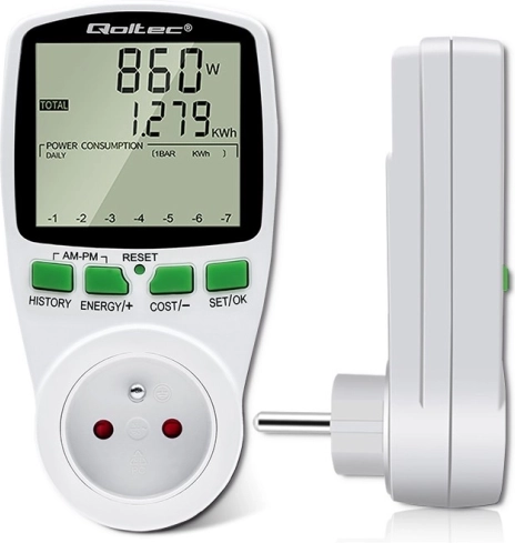 Den smarte stikdåse-forbrugsmåler Qoltec PM0627 hjælper dig med at reducere elregningen takket være præcis overvågning. Den tilbyder stor baggrundsbelyst LCD, 7 visningstilstande, omkostningsberegning, forbrugshistorik og overbelastningsbeskyttelse. Sæt den blot i, og mål effekt, energi og pris med det samme.