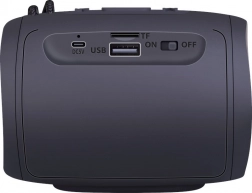 Bluetooth 5.3 til trådløs afspilning, microSD/TF-slot og USB til musik fra medier samt opladning via USB‑C (DC 5 V). Betjeningselementerne er bekvemt inden for rækkevidde.