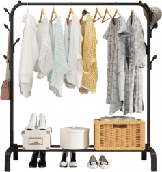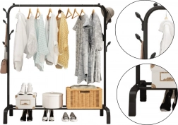 Dette fritstående stativ til kjoler og frakker tilbyder generøs plads til ophængning af tøj samt en praktisk hylde til opbevaring af sko, kasser eller kurve. Den robuste ramme af stålrør med sort overfladefinish sikrer lang levetid og et elegant, minimalistisk design, der passer ind i enhver indretning.