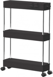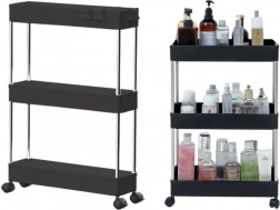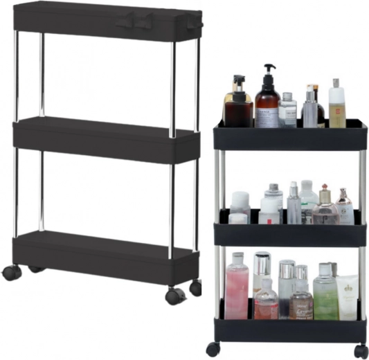 Den universelle rulle-reol med tre rummelige hylder er ideel til at spare plads og hurtig omrokering i hjemmet. Hjul med bremse sikrer let flytning og stabilitet på stedet, mens det elegante sorte design passer perfekt ind i både moderne og industrielle interiører.