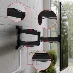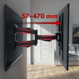 Dette holdbare vægbeslag gør det nemt at placere dit tv i stue, soveværelse eller kontor. Med den dobbelte ledarm kan du nemt trække tv’et ud fra væggen 57–470 mm, dreje det til den ønskede vinkel og vippe det i området +2° til -12° for perfekt udsyn uden refleksioner.