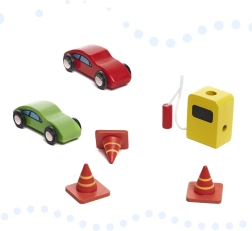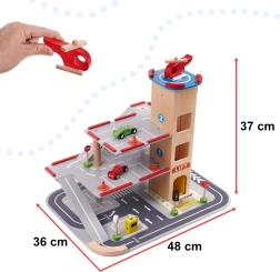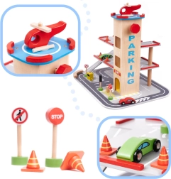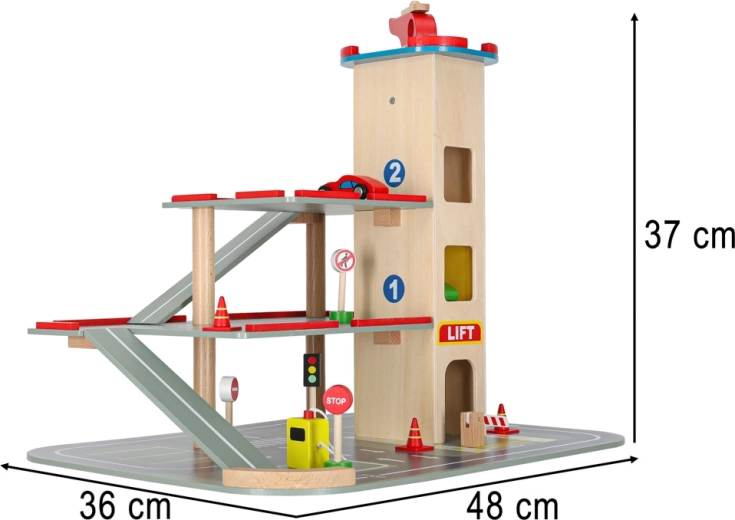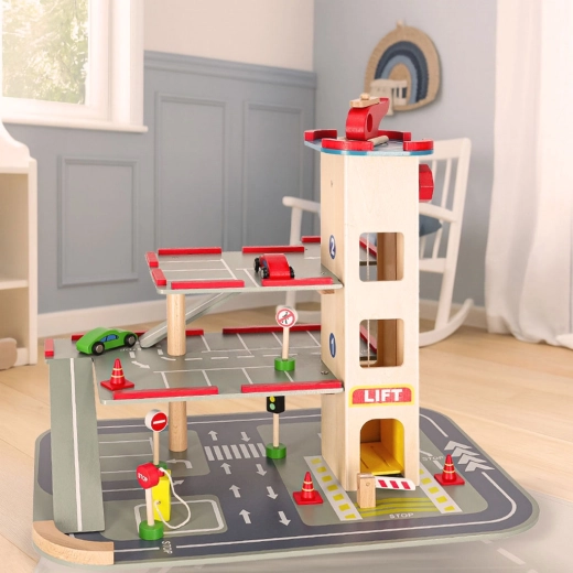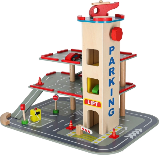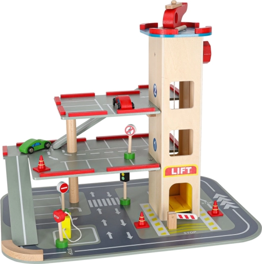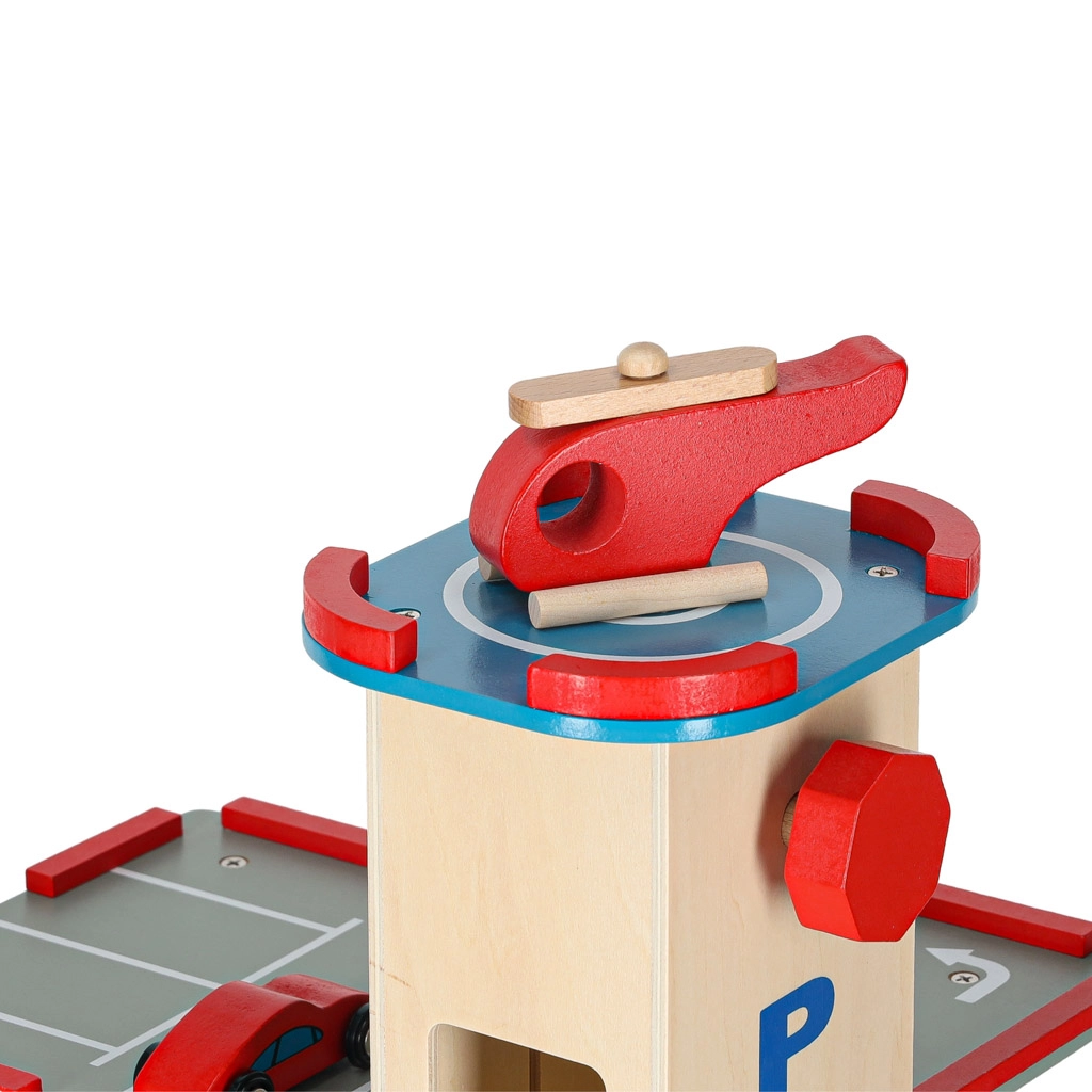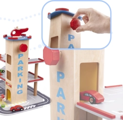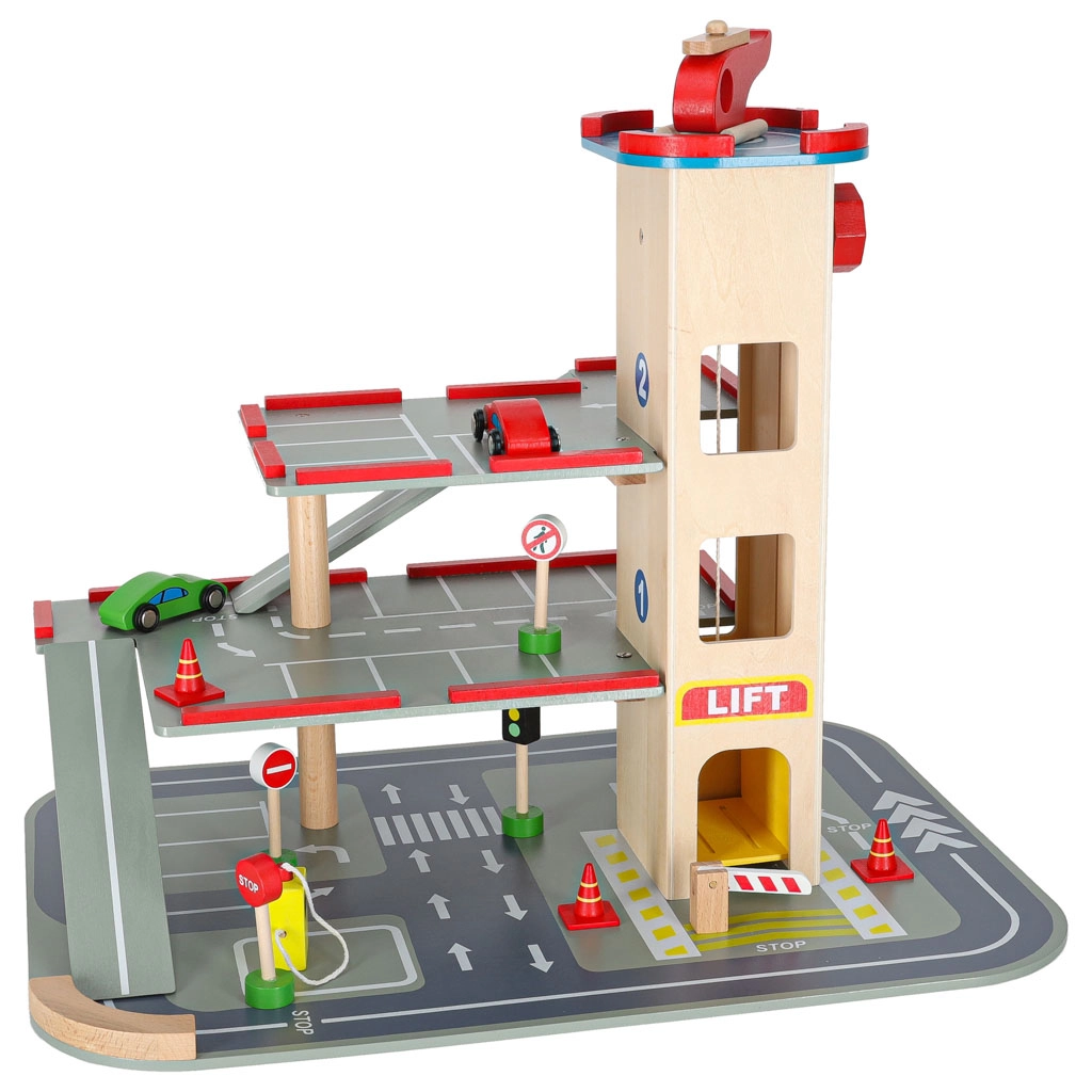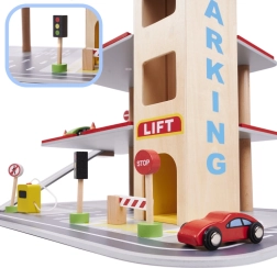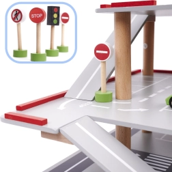 Parkeringshuset er yderst robust takket være sin bearbejdning, og de enkelte dele tilbyder en detaljeret finish, der er behagelig at røre ved. Byggesættet giver to muligheder - opbygning af selve parkeringshuset og en efterfølgende bilbane.