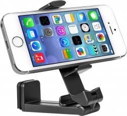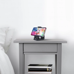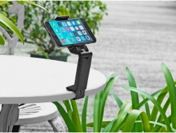 Kompakt og bærbar telefonholder til enhedsbrede på 55–96 mm, som tilbyder sikker fastgørelse, justerbar vinkel og hands‑free brug hjemme, i bilen og på farten. Takket være hurtig montering uden værktøj kan den nemt sættes på bordkant, barnevogn eller instrumentbræt, eller bruges som selvstændigt bordstativ.