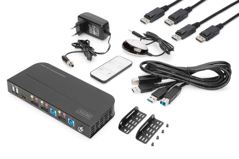 Digitus KVM-switchen lader dig tilslutte to computere via 2× DisplayPort og dele én skærm, ét tastatur og én mus. Udgang kan føres via HDMI 2.0 eller DisplayPort 1.2 med opløsning 4K@60 Hz, inklusive understøttelse af HDCP 2.2, HDR og FreeSync. Omskiftning kan ske med knappen på frontpanelet eller via den medfølgende IR-fjernmodtager.